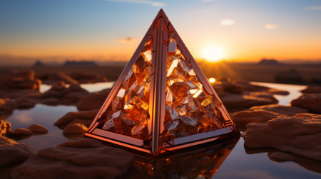 Pyramid made of stained tiffany glass in the desert. Created with Generative AI technology
