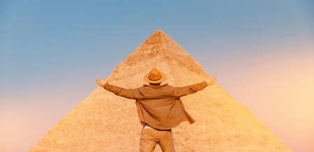 Man tourist walks background of pyramids in Giza Cairo Egypt, sun light travel banner