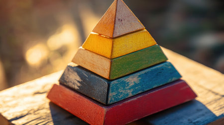 A close-up of the top of a multicolored wooden pyramid toy with sunlight highlighting its edges.
