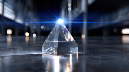 A crystal pyramid prism sits on a reflective surface, capturing a single beam of light and transforming it into a brilliant display of color.