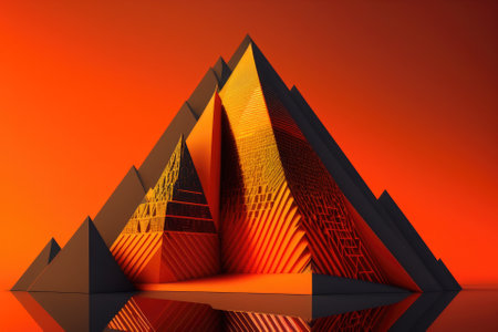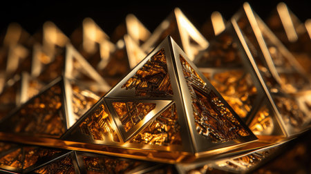 A stunning golden pyramid structure featuring triangular shapes, set against a dark textured background, symbolizing wealth and stability in design.