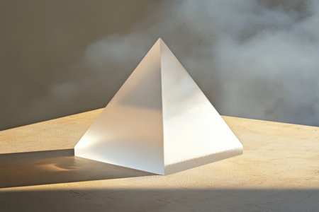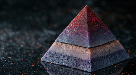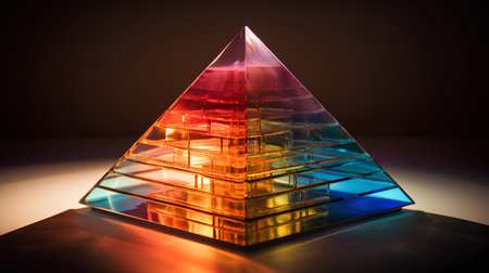 A vibrant pyramid prism displays a stunning array of colors, casting beautiful reflections on a smooth surface. Ideal for creative and artistic projects.