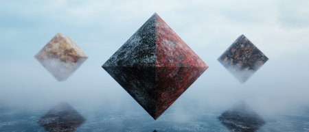 Explore the surreal beauty of these floating pyramids adorned with glowing symbols, set in a cosmic landscape that inspires wonder and discovery.