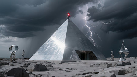 Futuristic abstract landscape with a pyramid and a lake in the background