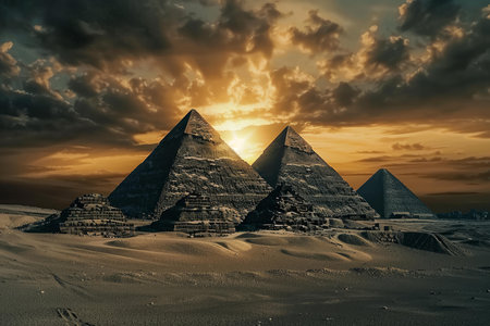 Egyptian pyramids at sunset and dramatic sky
