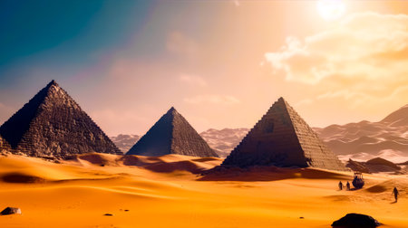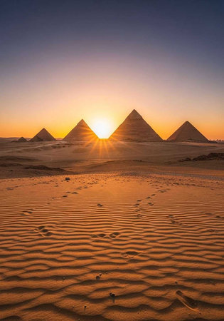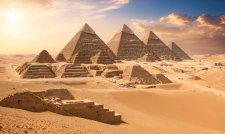 Majestic pyramids rise from the desert sands under a vibrant sunset sky in egypt