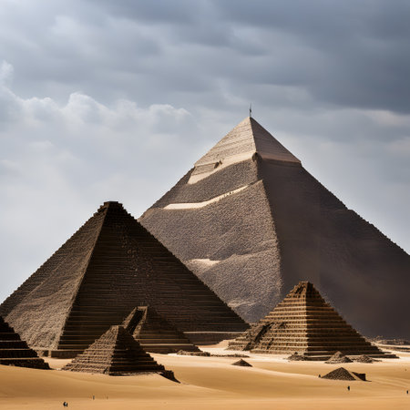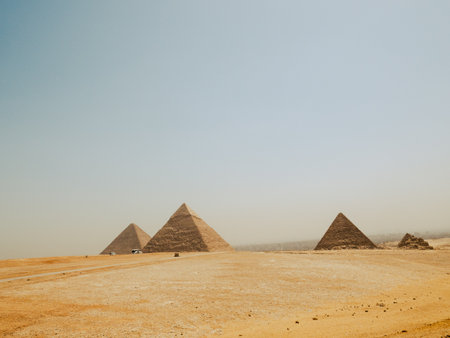 The Great Pyramids of Giza stand tall in the desert, a testament to ancient Egyptian engineering