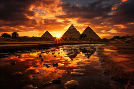 evening shot in the setting sun on the pyramids .view from the ground from below. reflection in water. Generative AI