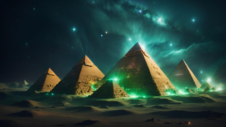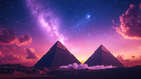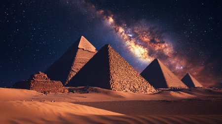 Experience the breathtaking sight of the pyramids illuminated by a stunning night sky filled with stars and the Milky Way, creating an ethereal landscape.