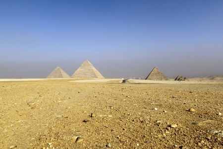 All three main pyramids of Giza. Pyramid of Menkaure, of Khafre or Chephren, of Khufu or Cheops and smal Queen’s pyramids.
