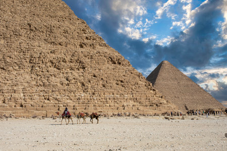 Pyramids of Giza, Cairo, Egypt and camels in the foreground