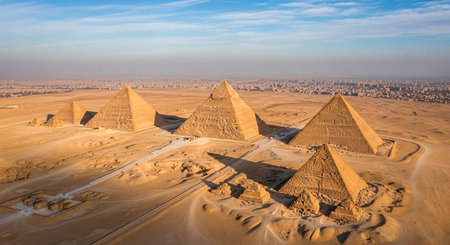 Iconic pyramids, golden hour hues, aerial drone view, distant horizons, photorealistic sunset setting Generative AI