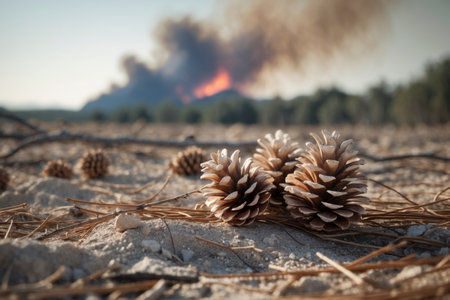 Several pine cones rest on dry, sandy ground. In the background, a dense column of smoke rises into the sky, indicating a nearby forest fire. The image symbolizes environmental destruction, heat, and the dangers of climate change.