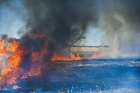 The raging flame of fire burn in the fields, forests and black thick acrid smoke.
