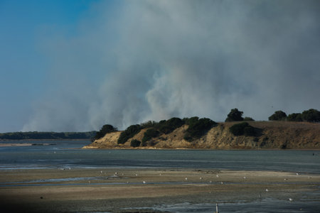 smoke rising from a field of burning crops during drought, created with generative ai