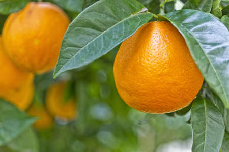 Branch of an orange tree loaded with juicy ripe fruits, in an organic cultivation field. Traditional agriculture.