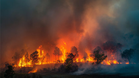 A dramatic scene depicting a wildfire consuming a forest, with vibrant flames and thick smoke creating a tense atmosphere, showcasing nature's raw power and intensity.