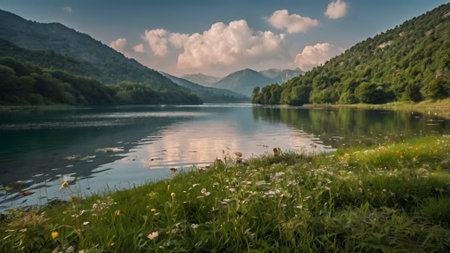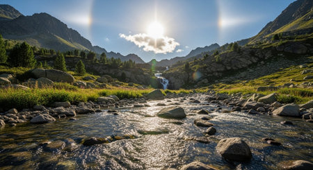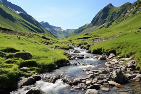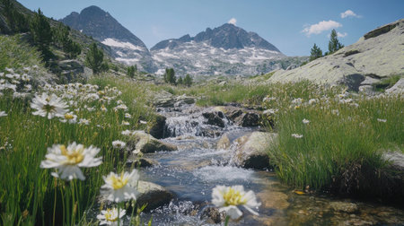 A breathtaking view of a serene mountain landscape featuring a gentle stream flowing through vibrant wildflowers. The blue sky and towering peaks create an idyllic outdoor scene.