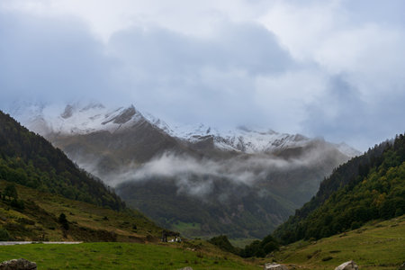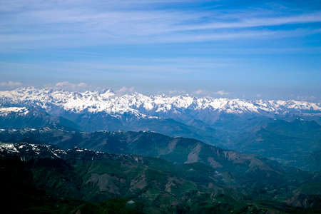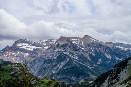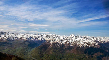 Landscape of snow-capped Pyrenean peaks, in the Ossau valley, in Béarn, France