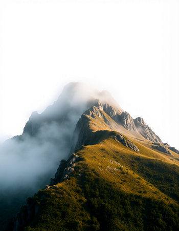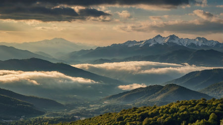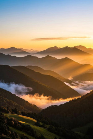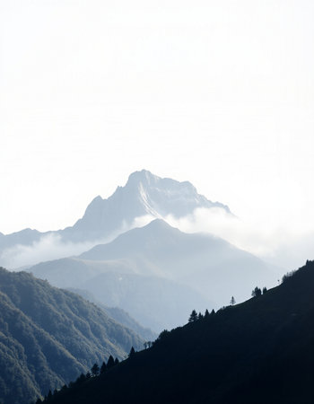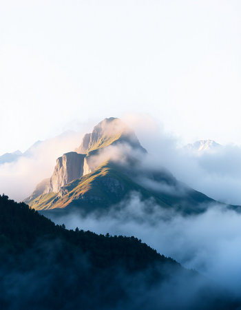 Experience the breathtaking beauty of serene mountains at sunrise, with soft fog gently rolling over valleys, creating a peaceful and tranquil atmosphere in nature.