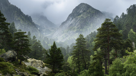A breathtaking view of a misty mountain landscape featuring towering evergreen trees and a soft blanket of fog, evoking serenity and tranquility in nature's beauty.
