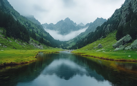 A serene valley showcases lush green hills and a clear river. Mist shrouds the mountains above creating a peaceful atmosphere in this natural wonder at dawn.