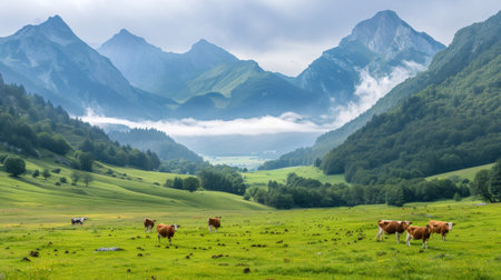 Idyllic landscape with cows grazing peacefully in a green meadow, with the Pyrenees mountains in the background and morning mist rising from the valley