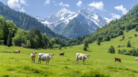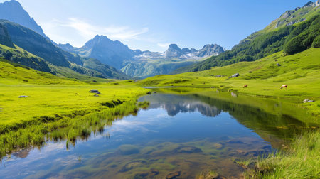 Breathtaking mountain range reflected on a pristine alpine lake with cows grazing peacefully in a green meadow