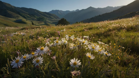 A serene landscape featuring a mountain meadow with numerous blooming white and yellow daisies in the foreground, green grass, and rolling hills in the background under a clear blue sky.