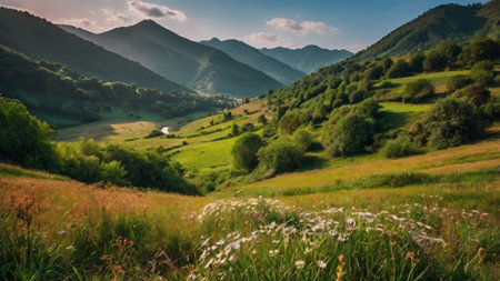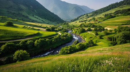 This stunning mountain valley scene captures the essence of nature with its vibrant greenery and soft blue sky, offering a serene escape into the great outdoors.