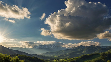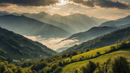 Beautiful mountain landscape with clouds in the sky and sunbeams