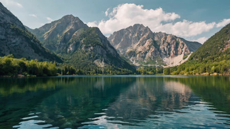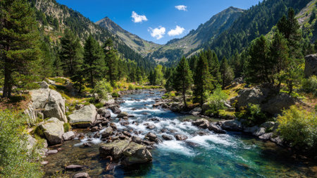 A breathtaking view of a tranquil mountain river flowing through a verdant forest, with towering peaks and a bright blue sky dotted with clouds. Perfect for nature enthusiasts.