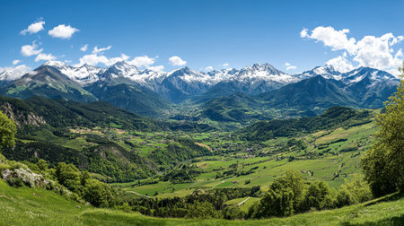 A panoramic view of the French Pyrenees, with lush green valleys and snow-capped peaks.