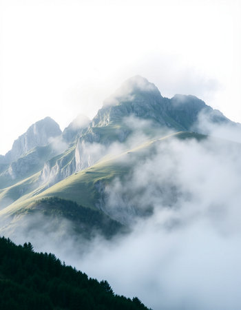 Experience the breathtaking beauty of a misty mountain landscape, where fog gently rolls over hills and trees, creating a serene and tranquil natural scene.