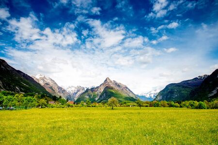 Beautiful view of idyllic mountain scenery with blooming meadows and mountain peaks on a beautiful sunny day with blue sky in spring