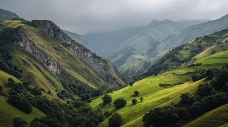Explore a stunning mountain landscape featuring vibrant green valleys and hills under a dramatic sky. Ideal for nature lovers seeking tranquility and beauty.