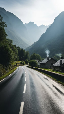 Countryside showing winding asphalt road through a misty mountain valley with traditional houses and smoke rising from chimneys on a bright day keywords: road,...