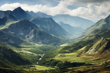 Beautiful green valley nestled between towering mountains under a cloudy sky, showcasing the untouched beauty of nature and the tranquility of the wilderness.