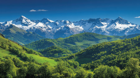 Snow-capped peaks tower above verdant hills, while a clear blue sky showcases the beauty of nature. The scene embodies tranquility and the grandeur of the mountains.