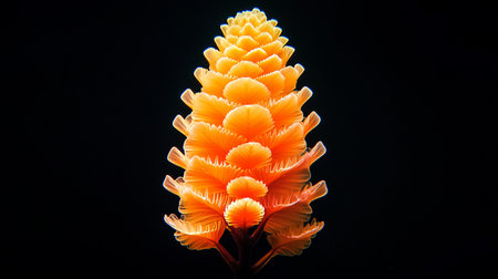 A striking orange flower bud with layered, petal-like structures, resembling feathers, arranged in a conical shape, against a dark background.
