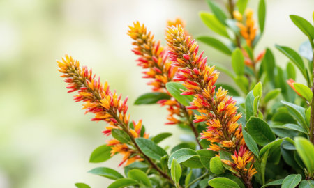 A striking lipstick plant, its vivid red flowers contrasting beautifully with the dark green foliage on a brown wooden background. The soft lighting adds a touch of elegance Houseplant in home garden.