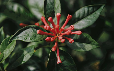 Bright red tropical blooms emerge from green foliage showcasing natural beauty in a captivating arrangement against a dark background.