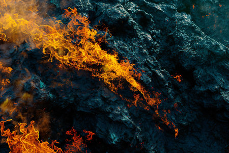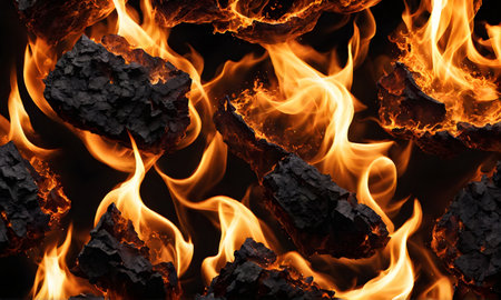 Background texture of vibrant fire on black surface creating dramatic contrast and depth
