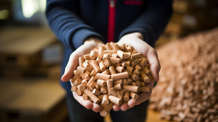 Pile of wood pellets in the hands of a female factory worker
