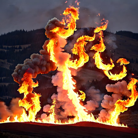 Dramatic explosion featuring bright flames and dense smoke against a moody sky. This intense scene captures the raw power and chaotic beauty of fire.