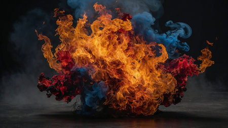 A powerful fire explosion fills the scene with vivid flames and smoke, showcasing the dynamic energy and intensity of a natural disaster.