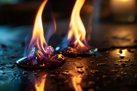 Chemical experiment showing different colored flames from various substances in laboratory glassware. Scientific demonstration for education.