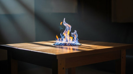 Intense blue and orange flames erupt from a circular burner set into the surface of a wooden table. The flames are dynamic and vibrant, with streaks of yellow and white at their hottest points. Sunlight streams in from an unseen source, casting distinct shadows and highlighting the wood grain of the table. The contrast between the warm, energetic flames and the solid, natural wood creates a visually striking and abstract composition.