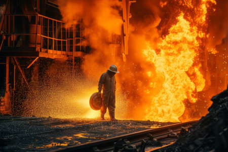 A factory worker stands in front of large openings, engulfed by billowing smoke and flames. The scene showcases industrial intensity, highlighting the dangers and energy of metal production.
