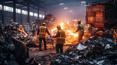 Workers in safety gear sorting through a pile of recyclable materials in the waste separation factory.